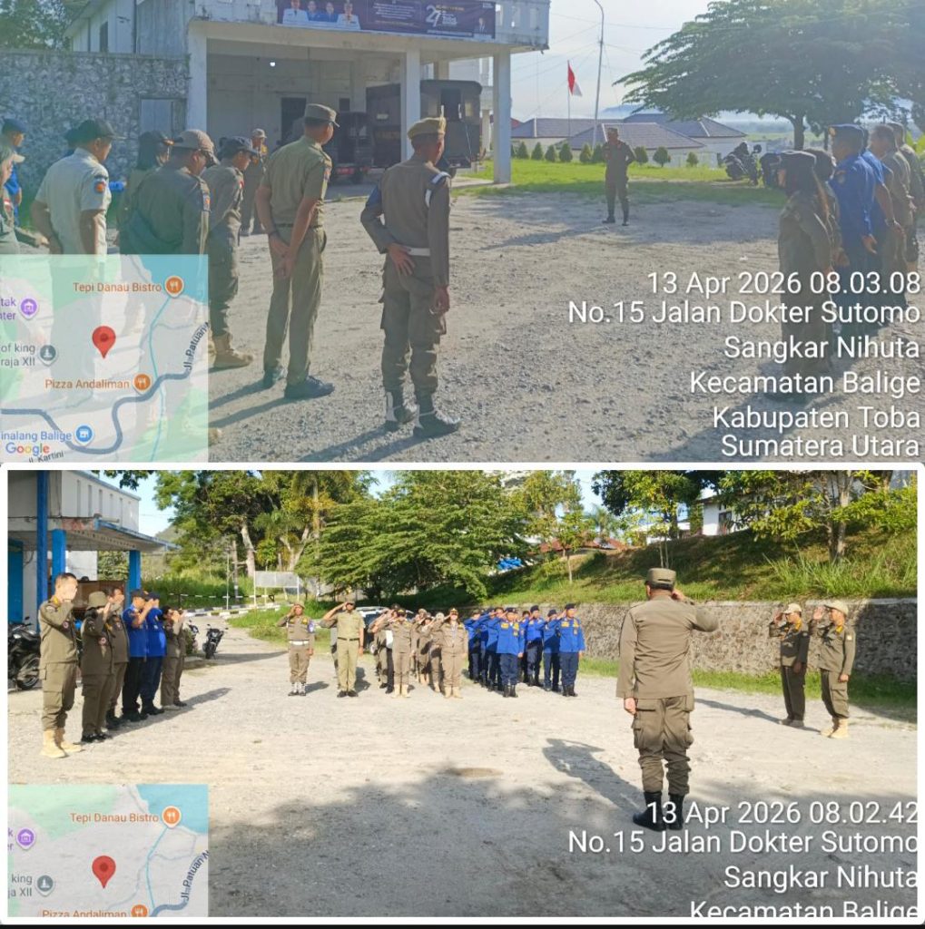 Balige, 13 April 2026, Pelaksana Tugas (Plt) Kepala Satuan Polisi Pamong Praja (Satpol PP) Kabupaten Toba, Hendri Rudi Jaya Sibarani, memimpin apel pagi rutin di Markas Komando (Mako) Satpol PP Kabupaten Toba pada Senin pagi. Apel tersebut diikuti oleh jajaran pejabat struktural, personel fungsional, serta seluruh anggota Satpol PP.